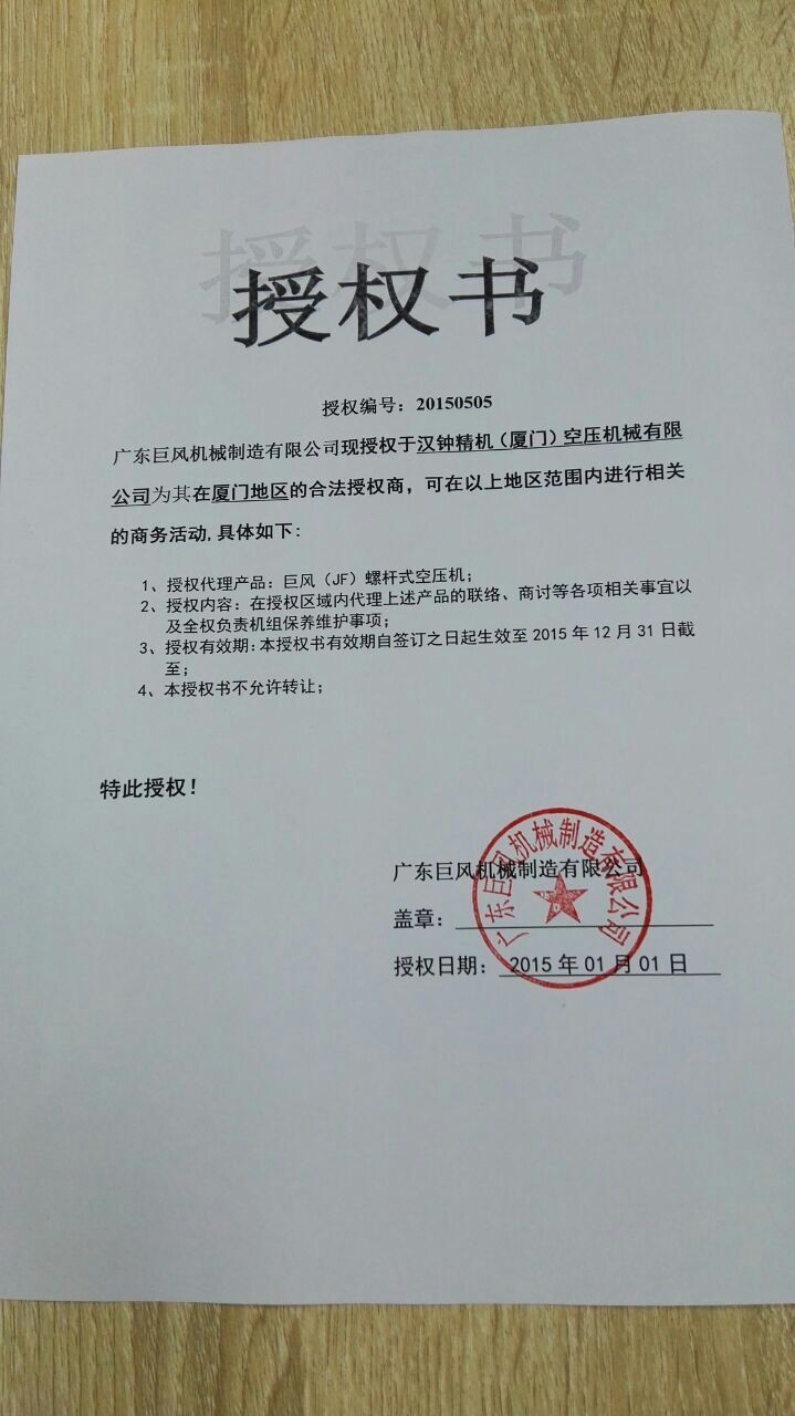 2013年8月福建建陽長風(fēng)授權(quán)廈門漢鐘精機(jī)有限公司----總代理經(jīng)銷權(quán)